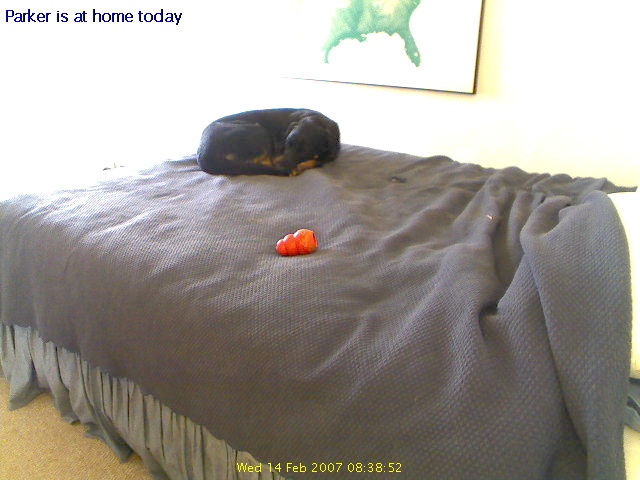 This also lets you, gentle reader, play "where's Parker?" all day. Is he by the door, hidden from view off to the left? Looking out the window? Or just lying on his back with his paws straight up in the air? Around 1pm, you might even get a glimpse of the dog-walking service.