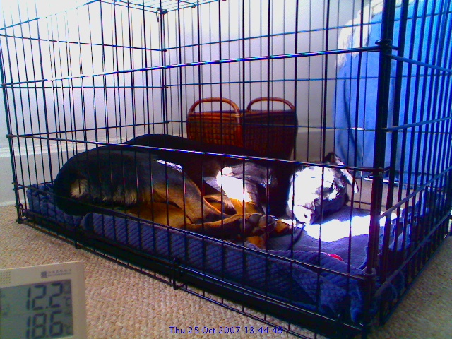 The splash of sunlight on Parker's face makes me think he's probably a pretty happy dog, despite the crate: