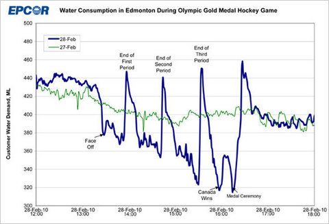 Via Freakonomics, the City of Edmonton noticed some unusual water-use patterns during the U.S.-Canada hockey game February 27th: