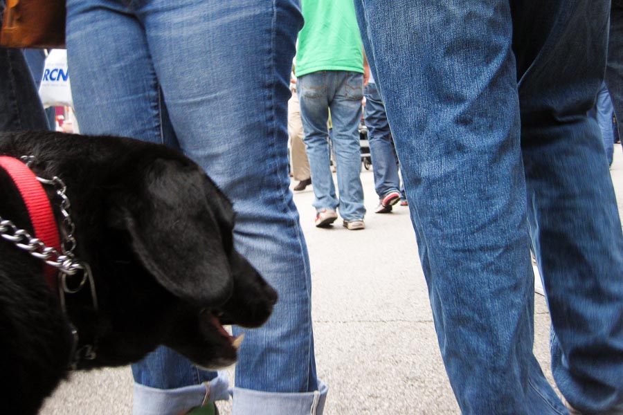 Parker didn't have the best time, though. I didn't give him much meat because I'm already stressing his digestive system by introducing a new dog food. (It turns out, Whole Foods turkey and rice formula is about half the cost of the Canine ID he's been eating, and apparently his cranky stomach can deal with it just fine.) This, after working more than 5 km there (plus almost 6 km to get back—but he wasn't thinking about that). To add insult, much of Parker's experience of Ribfest looked like this: