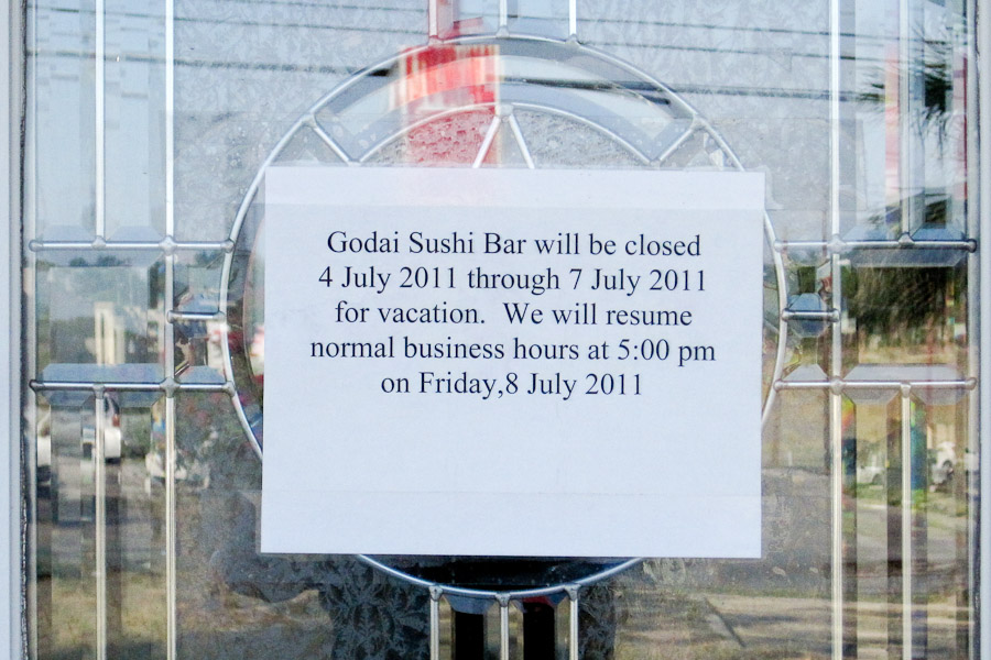 I did, however, find a sushi restaurant only a few kilometers[1] from the hotel that got great Yelp reviews. Only, I should have called first: