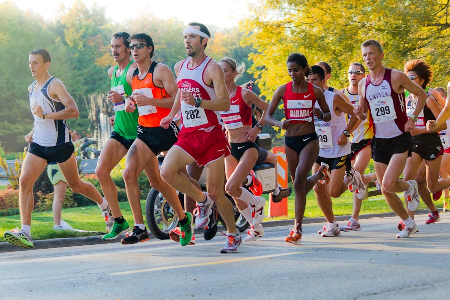 The women's leaders, Ethiopian Ejegayehu Dibaba, 29, and Russian Liliya Shobukhova, 33, run past the 9 km point during today's Chicago Marathon: