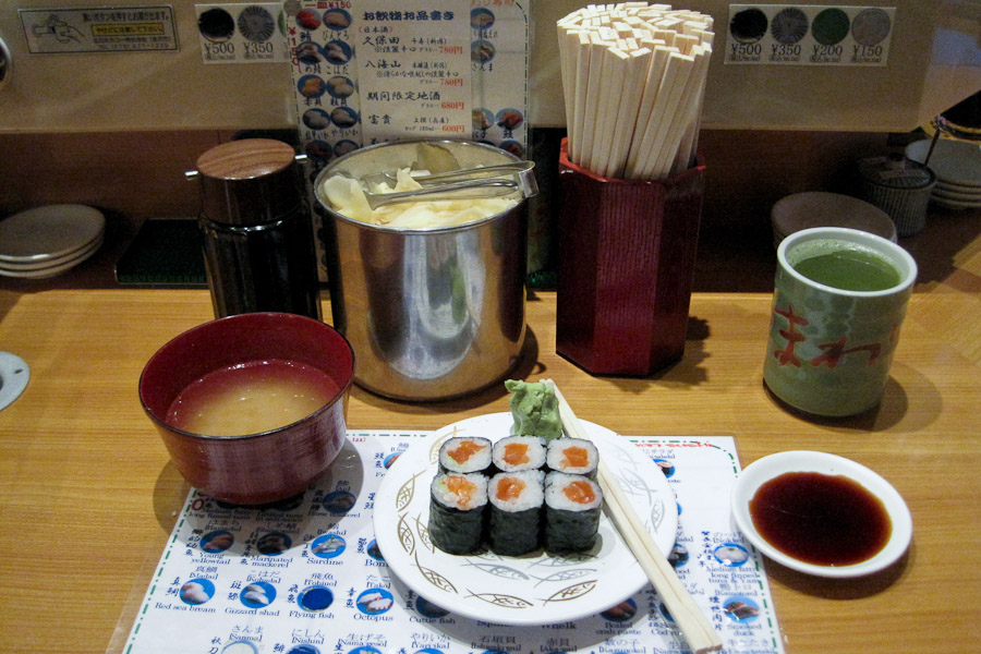 ...plus a salmon roll, a pair of shrimp nigiri, and a pair of grilled salmon nigiri. And it was yum.