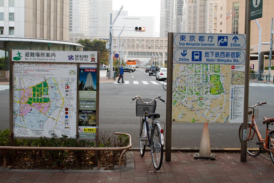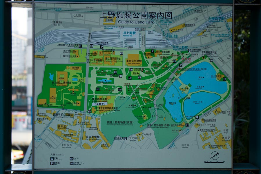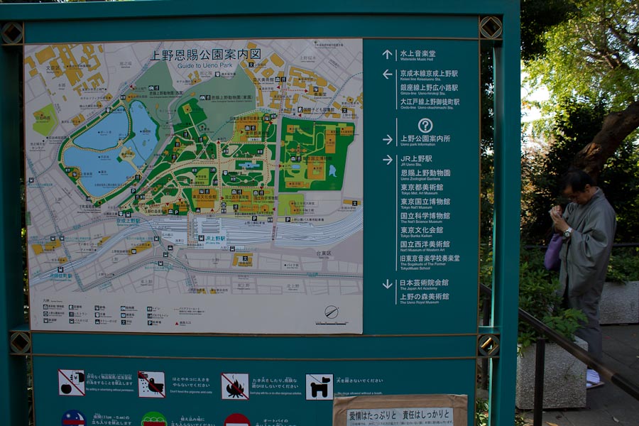 Tokyo has maps in all the metro and train stations showing where you are and where everything else is. However, throughout the city I found exactly one map where north was on top. Otherwise, they were all oriented in different directions. Here are two maps near Ueno-Koen within sight of each other that illustrate the problem. Exhibit A, with north towards the bottom left:
