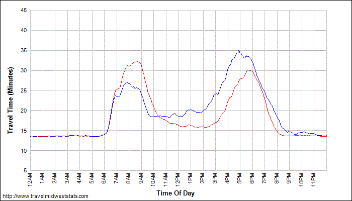 In the last few years, though, the Illinois Dept. of Transportation and neighboring agencies have created Travel Midwest, which has vast stores of traffic data. This has helped me stay sane. The site allows you to query the database to find out, in simple visual charts, when traffic is worst.