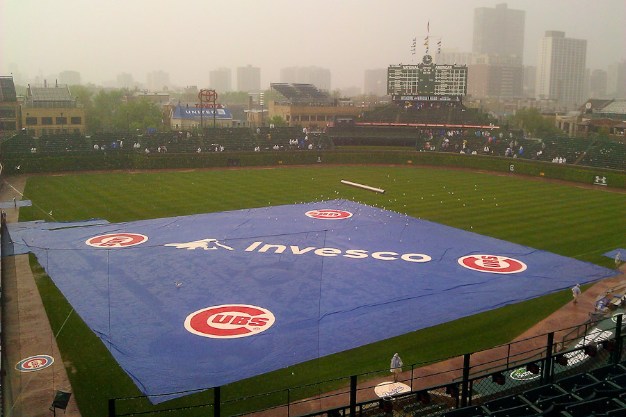 Thunderstorms yesterday delayed the start of the Cubs-Dodgers game yesterday, with a first pitch almost three hours later than the scheduled 1:20pm start time. We got to the park at 2:30 during a brief break in the rain, relieved to discover the game was still on, and that we'd dressed warmly enough for it.