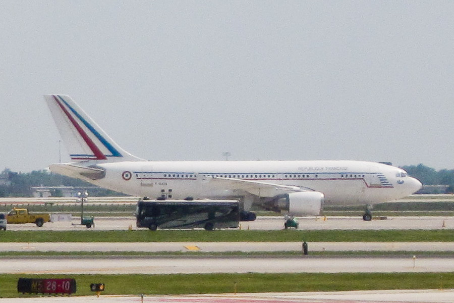 I've never seen this before. Here's the French presidential airplane, parked on the south apron at O'Hare yesterday: