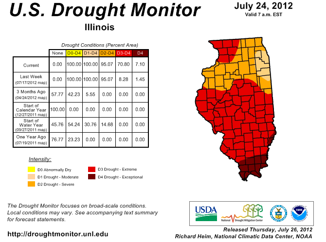 The latest U.S. Drought Monitor has expanded D3 “extreme” drought across Illinois. It went from 8 percent of the state last week to 71 percent this week. This major shift was based on a number of short-term drought indicators based on rainfall, streamflow, and temperature, as well as from widespread reports of significant crop and pasture losses.