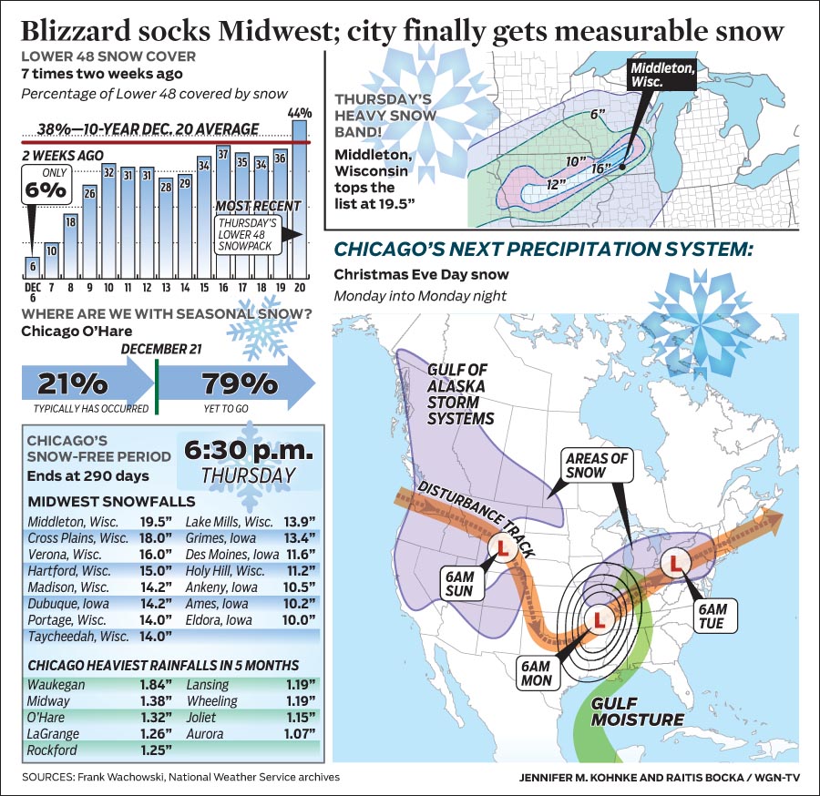 Downtown Chicago got the merest whisper of snowfall last night; O'Hare, our official station, got enough to set two records—in the negative.