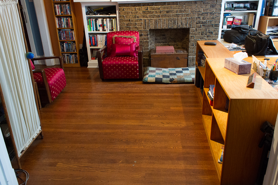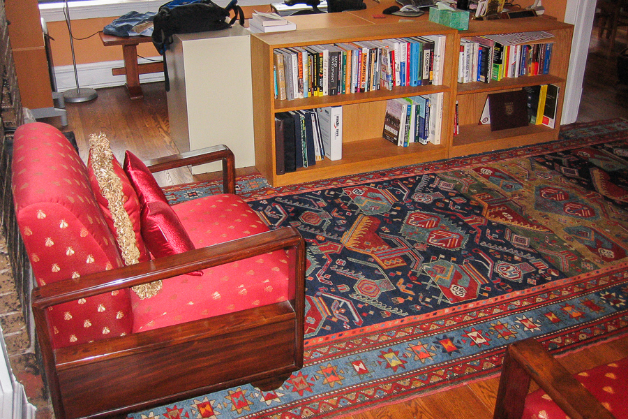 My poor sick dog didn't completely destroy my rugs, but Eli Peer has a job on his hands. Even without the, uh, contributions from Parker last week, the six years of accumulated dog hair mitigated in favor of a good deep cleaning as well. Eli recommends cleaning rugs every couple of years, so mine were long overdue anyway. Judging by the portion covered by the bookshelves in the photo below—a portion without dog hair, dirt, and innumerable other insults—they looked pretty dire. Here's the room in 2008: