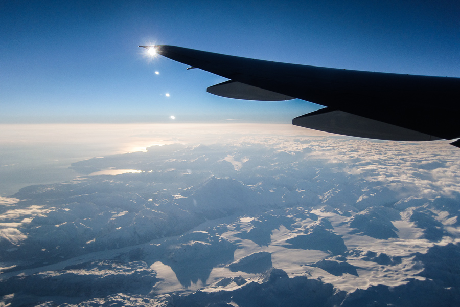 Our flight path yesterday followed the terminator as the earth turned. The sun stayed right on the tip of the left wing for about 90 minutes before we jogged slightly west over Kamchatka.