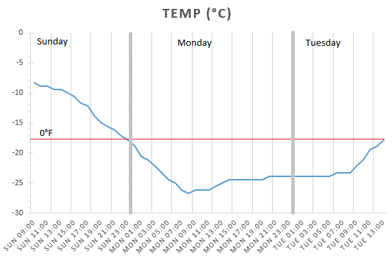 The temperature at O'Hare just reached -18°C for the first time since 11pm Sunday, 39 hours ago: