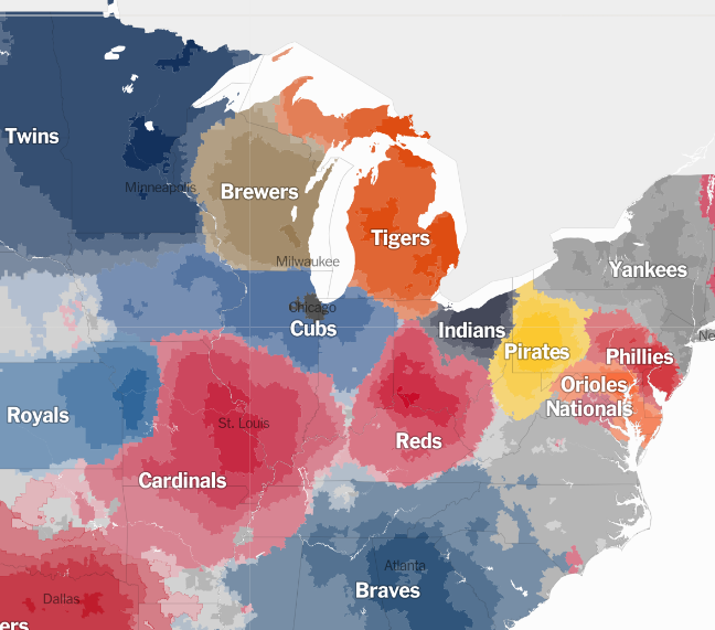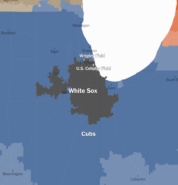 The New York Times has an interactive map of which ZIP codes support which baseball teams, according to Facebook.