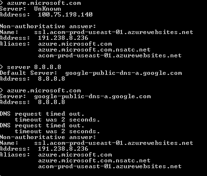 From my local computer, sitting in downtown Chicago, both Google and my company's DNS servers point "azure.microsoft.com" to an Azure web site sitting in the North Central U.S. data center, right here in Chicago. But for the VM, which itself is running in the East U.S. data center in southern Virginia, both Microsoft's and Google's DNS servers point the same domain to an Azure web site also within the East U.S. data center.