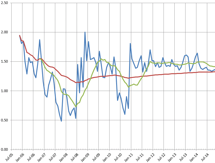 The green line is the 12-month moving average, which I have (alas) brought down most of this year. The red line is the raw mean, which, because of mathematics, has gone up every month since December 2010.
