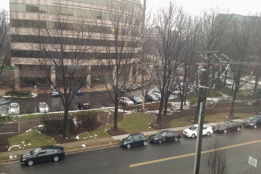 Even if it weren't rainy and getting dark outside, this isn't the most appealing view I've ever had from a hotel window: