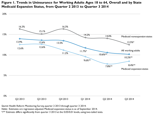 The difference is even more pronounced in states that expanded Medicaid under the law. In those states, the uninsured rate dropped from 12.6 percent to 8.4 percent from the second quarter of 2013 to the third quarter of 2014.