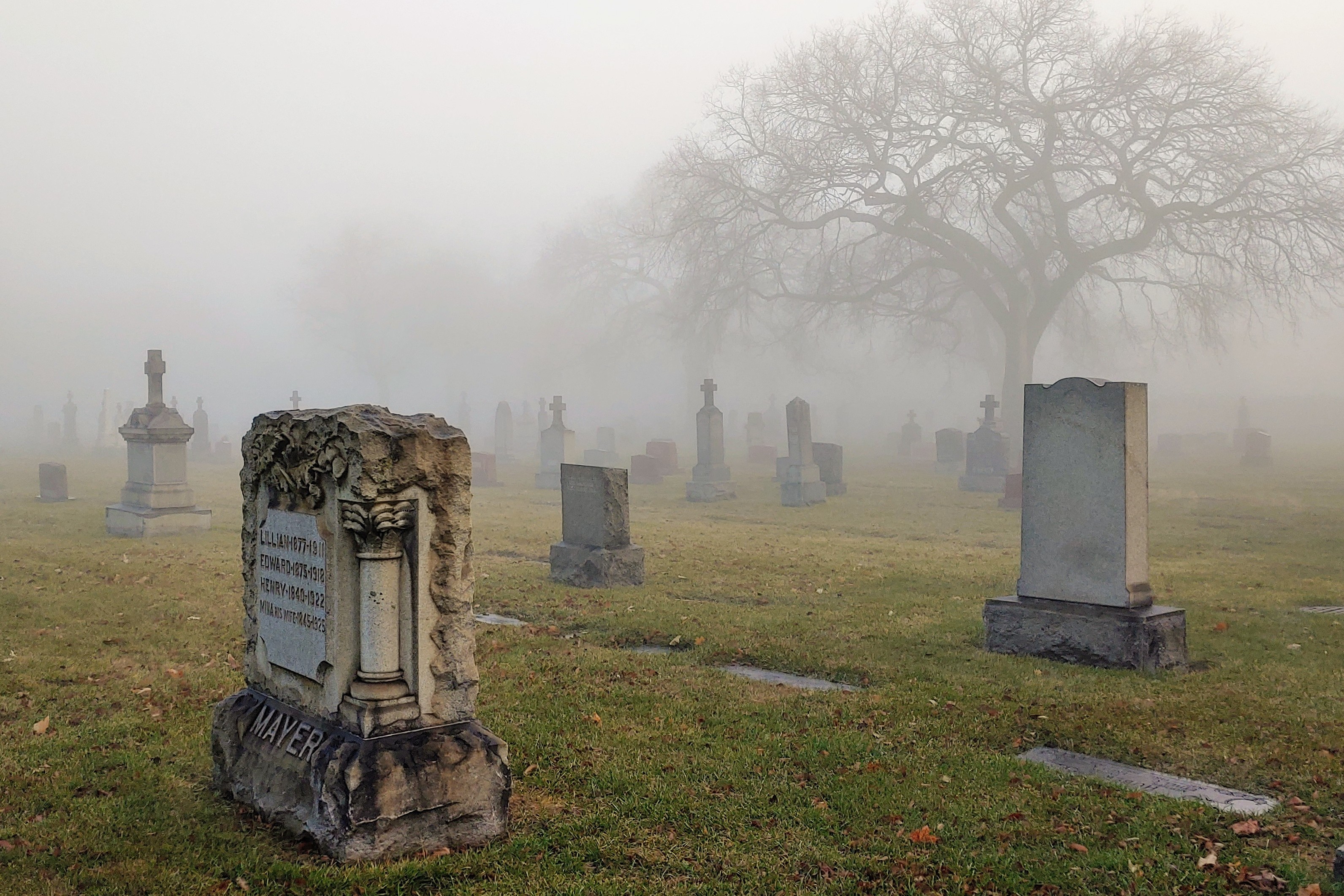 That's the cemetery in my neighborhood a few minutes ago. And that's what we call "dense fog," with about 200 m visibility and what they call "indeterminate" ceilings at 100 m.